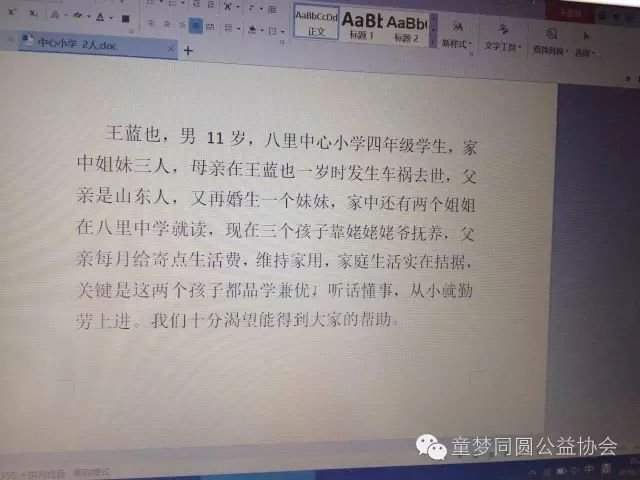 7、王蓝也,男,就读于鞍山市海城县八里镇中心小学四年级。家中有三个孩子,孩子父亲在山东养大挂车,每个月都会给孩子姥姥寄生活费,孩子母亲去世。