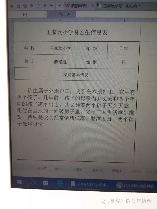 16、薛艳胜,男,就读于鞍山市海城县八里镇王家坎小学四年级;薛艳宇,男,就读于鞍山市海城县八里镇王家坎小学一年级。父亲带着两个孩子从黑龙江来到海城,租房子住,房租1000元/年。因父亲长期喝酒,母亲被打离家出走,至今未归。父亲开叉车,养活两个孩子。