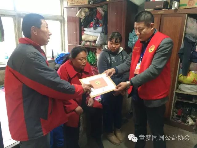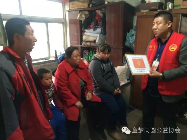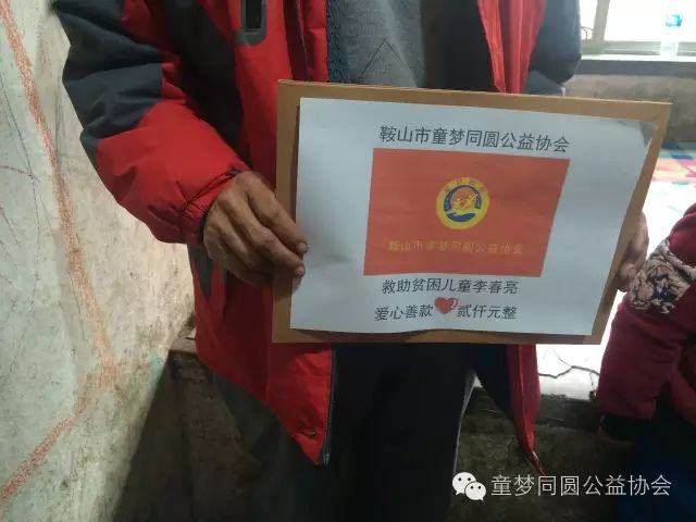 2016年11月3日,在鞍山市童梦同圆公益协会会长董俊丰、常务副会长李春久的带领下,童梦同圆一组、五组会员与鞍山电视台记者一行十余人共同来到辽阳县下达河镇的贫困儿童李春亮的家中,并为他送去2000元爱心助学基金。