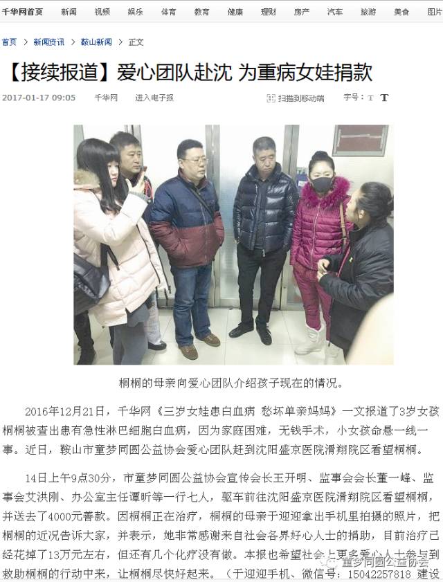 2016年12月21日,本报《三岁女娃患白血病 愁坏单亲妈妈》一文报道了3岁女孩桐桐被查出患有急性淋巴细胞白血病,因为家庭困难,无钱手术,小女孩命悬一线一事。近日,鞍山市童梦同圆公益协会爱心团队赶到沈阳盛京医院滑翔院区看望桐桐。
