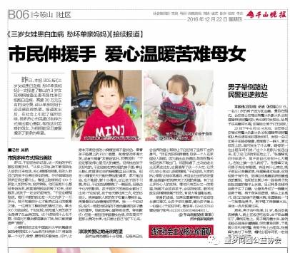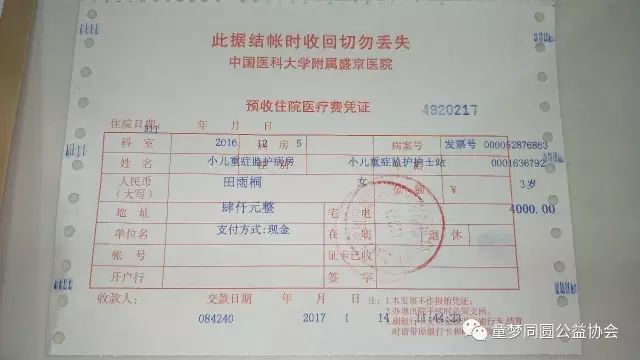 2017年1月14日上午9点30分,鞍山市童梦同圆公益协会通过千山晚报看到《三岁女娃患白血病 愁坏单亲妈妈》一文报道了鞍山的3岁女孩桐桐被查出患有急性淋巴细胞白血病,需要30万元左右的治疗费,童梦同圆协会及时召开常务理事会议,决定由协会宣传会长王开明、监事会会长董一峰、监事会副会长艾洪刚、办公室主任谭昕等一行七人,驱车前去沈阳中国医科大学附属盛京医院滑翔院区,为患有急性淋巴细胞白血病3岁女孩桐桐及时送去爱心善款,协会捐款3000元,监事会副会长艾洪刚捐款500元,办公室主任捐款谭昕500,共筹计善款4000元。