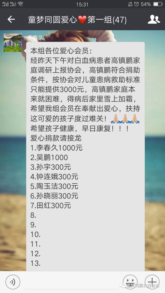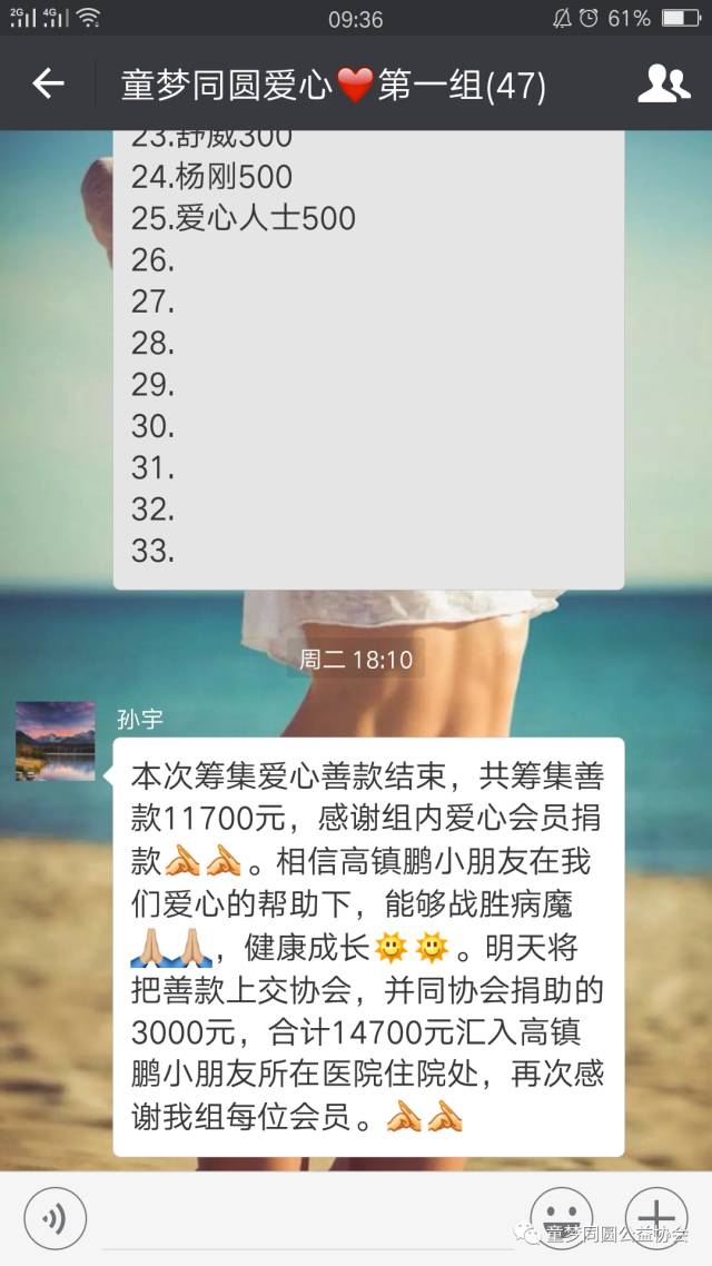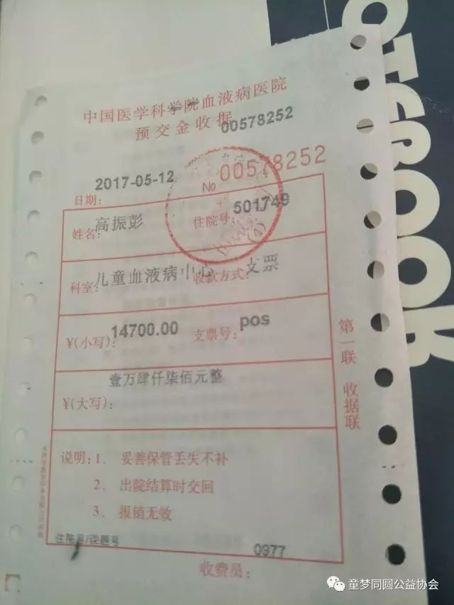 调研过后,一组会员立即回到协会办公室与协会领导进行协商,经讨论后决定为小振彭捐助3000元爱心善款并于2017年5月9日在一组群内为小振彭筹集爱心善款,短短十二个小时的时间,共为小振彭筹集爱心善款11700元。于2017年5月12日上午,由本协会的财务人员将一组会员筹集的11700元爱心善款及童梦同圆捐助的3000元爱心善款共计14700元存入到小振彭妈妈江雪艳的银行账户中,小振彭妈妈第一时间将这14700元爱心善款存入到小振彭的医疗账户中,并将回执反馈给我们,对童梦同圆及爱心会员们的善举表示感谢。同时也相信高振彭小朋友在我们爱心的帮助下,能够战胜病魔,早日康复,健康成长!!!