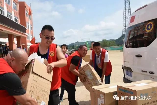2017年8月11日,在市慈善总会韩秘书长、义工部杨部长及本协会几位领导的组织与带领下,童梦同圆一行40余人来到前营子镇中学(重灾区救援点之一)为那里受困的灾民们送去米、面、矿泉水、衣物等生活必需品,价值约8.39万元。