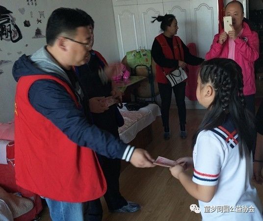 三组组长谭昕将童梦同圆的1200元阳光助学金交到小语嫣手中