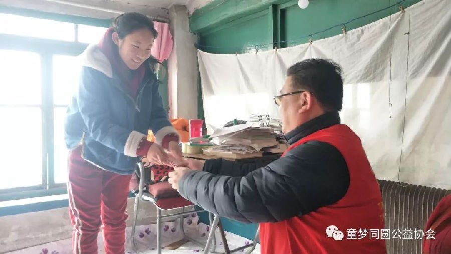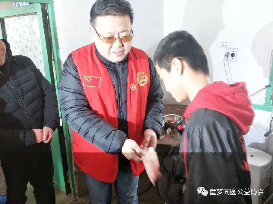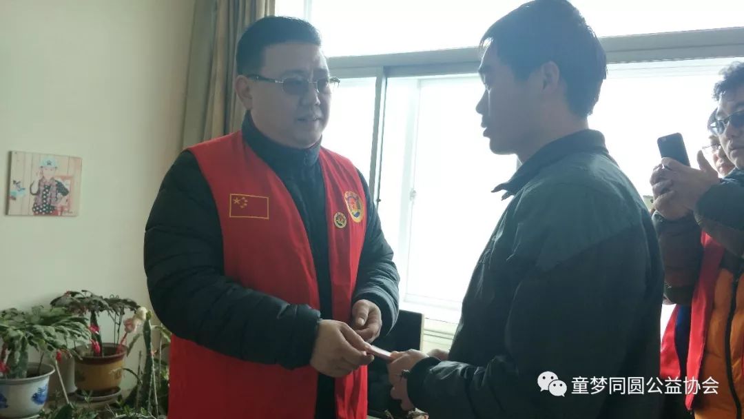 第三分会副会长谭昕将1200元阳光助学基金交到小振博的父亲手中