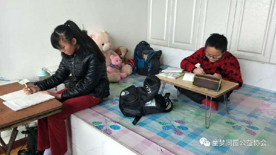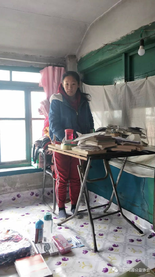 由于家庭环境寒冷,贫困学生李佳怡只能将家里的书桌放置在炕上学习