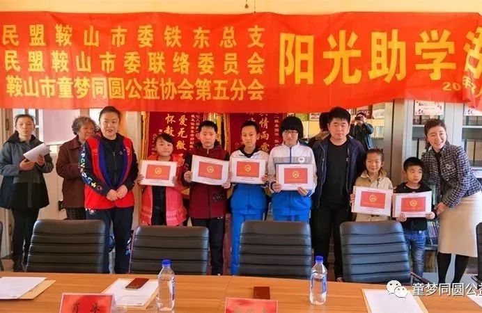 1、民盟鞍山市委铁东总支主委肖冰、民盟鞍山市委联络委员会副主任毕翔宇、鞍山市童梦同圆公益协会第五分会副会长曹淑君为张明玥、田家宝、陈梦瑶、黄旭栋、孙仲泽、王高原六名受助学生捐赠阳光助学基金。(每人1200元阳光助学基金,总计7200元)