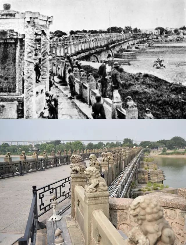上图为日军占领下的卢沟桥(资料照片);下图为2017年7月3日拍摄的卢沟桥(新华社记者 张晨霖 摄)。