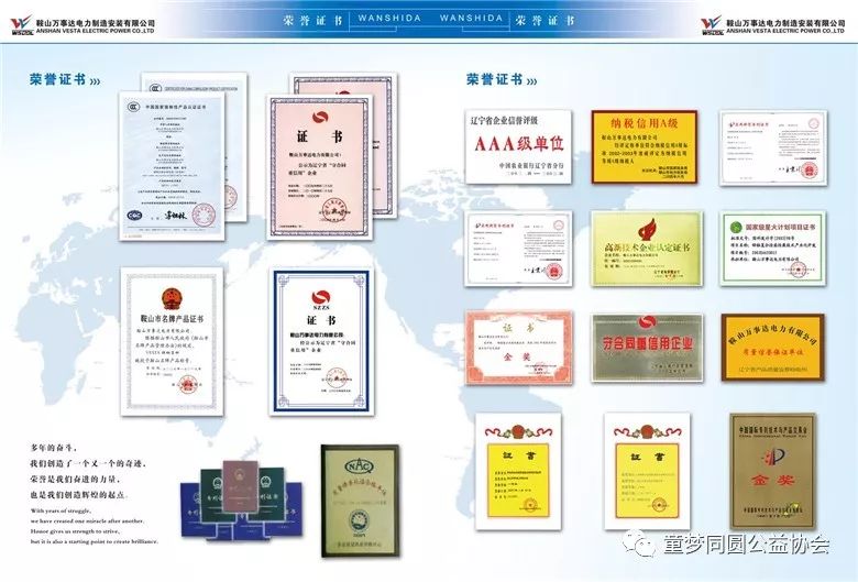 我公司以重合同守信誉、用户第一为宗旨,产品质量可靠、售后服务及时,在用户中树立了良好的企业形象,赢得了很好的商业信誉。我公司生产的钢管杆塔在2000年起被鞍山市人民政府评为鞍山市名牌产品。公司自2001年起被辽宁省工商行政管理局命名为“重合同守信用单位”,被辽宁省产品质量监督检验所授予“质量信誉保证单位”;2002年通过由东北认证有限公司认证的环境、质量、职业安全健康三项管理体系;2002年被辽宁省科学技术厅认定为“高新技术企业”;2003年被中华人民共和国人事部、全国博士后管委会指定为“博士后科研工作站”;2004年被鞍山市国税局及鞍山市地税局评为A级纳税人;2005年“万事达”商标被辽宁省及鞍山市工商行政管理局评为“著名商标”。2005年末被辽宁省工商行政管理局评为“辽宁省著名商标”。公司历年多次受到省、市及国家相关部门的表彰和嘉奖。
