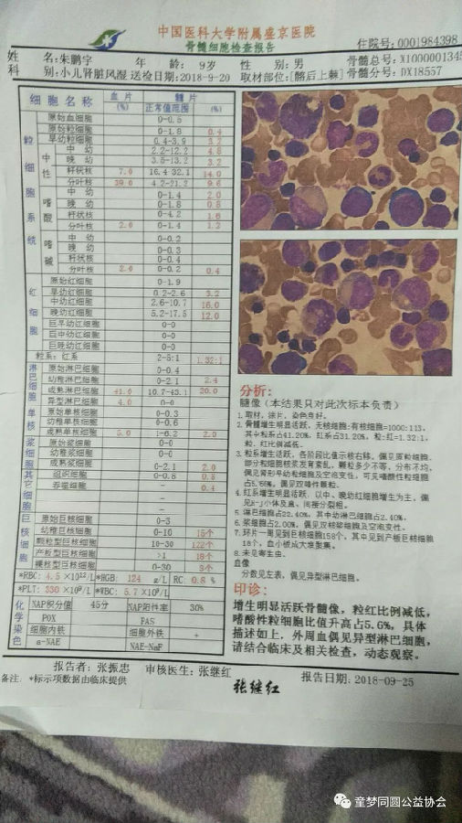 朱鹏宇,男孩,10周岁,就读于山南小学,父亲开出租车,母亲没工作,现在在鞍山市铁东区安乐街租房住,孩子大爷智障需要孩子父亲赡养。2018年8月23日早起突然两腿疼不能站立走路,不能回弯,伴随关节疼痛。背到鞍山妇儿医院和鞍山中心医院没有明确诊断,后到沈阳骨科医院检查后,次日稍有好转能独自行走。2018年9月到沈阳医大盛京医院住院治疗,经全面检查,但是没有明确确诊。由于疼痛加重于2018年10月下旬到北京儿童医院住院检查,最终确诊为幼年特发性关节炎。需要长年吃药,每月定期去北京儿童医院复查,根据病情增减药量,每日吃4-5种药控制病情发展,药物产生副作用非常严重,会导致孩子身体停止生长,孩子除了本身病痛外还得承受药物带来的副作用每天都会肚子疼胃疼恶心吃不下饭,每周在鞍山进行肝功,肾功的化验。现在肝功异常出现转氨酶升高,每天需要吃两种保肝药。孩子学习成绩优异,重病的情况下一直坚持学习,期末考试成绩数学90语文87英语95.5。孩子性格乐观向上,无论病情多重都会坚持每天学习。