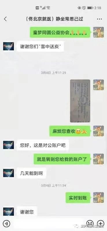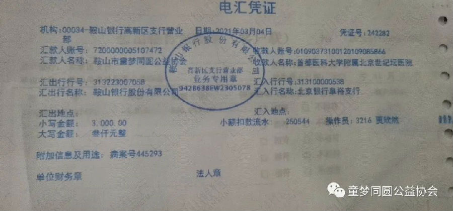 鞍山市童梦同圆公益协会于2021年3月4日开展了“学雷锋•助重大疾病儿童幸福成长”活动,为远在首都医科大学附属北京世纪坛医院住院的恶性脑肿瘤患儿佟学良,通过电汇的方式,汇去3000元爱心善款,希望孩子可以早日康复。