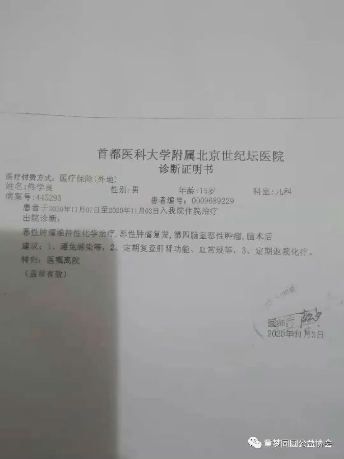 孩子佟学良,今年16岁,家住在岫岩满族自治县红旗营子乡矿山村后佟家堡组。爸爸佟守山、妈妈刘文波都是农民。孩子患第四脑室恶性肿瘤,去年2月份病情再次复发,由于病情严重医生建议转院到北京的医院,目前已经花光家里积蓄,一身外债、东挪西借的,不敢给亲朋好友打电话,都害怕借钱。孩子一直用西药化疗,身体已骨瘦如柴,肿瘤还没有控制住,医生说复发的病人存活率只有百分之几的希望。孩子现在在北京接受治疗,母亲一边照顾孩子一边在老乡的饭店干活没有报酬,但老乡为孩子家庭解决了吃住的问题,父亲在外面打零工,高额的医疗费用压得他们喘不过气来。但是为了让孩子能慢慢的好起来,再苦再难也会坚持。
